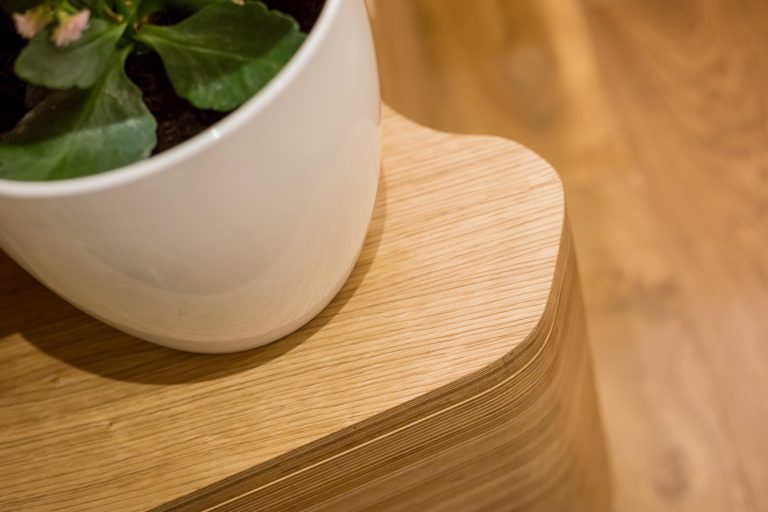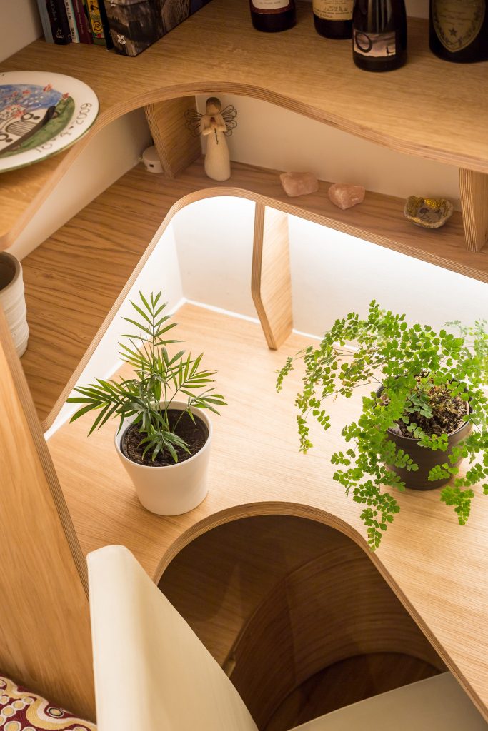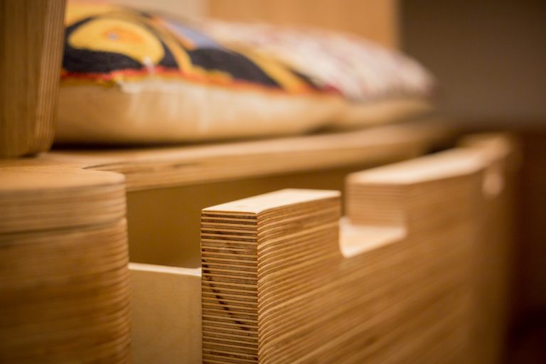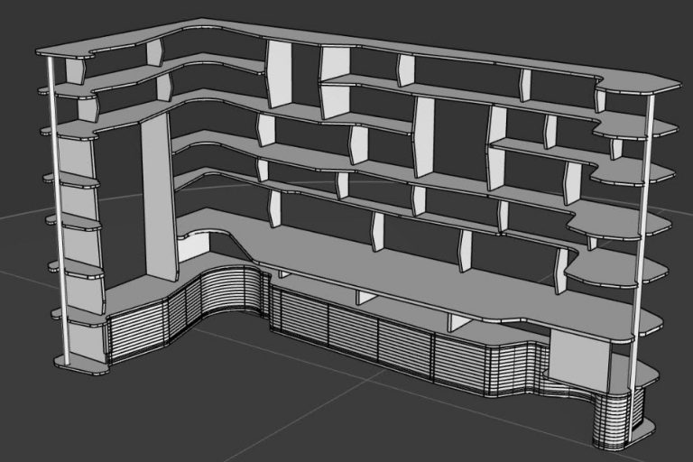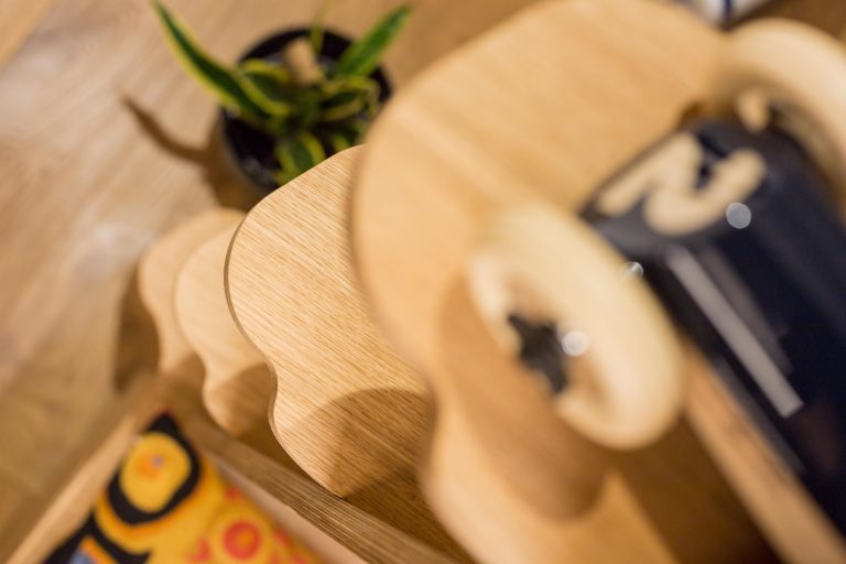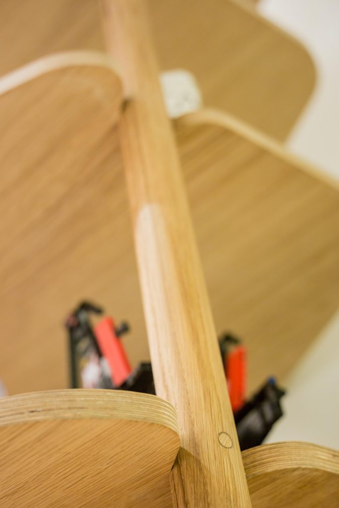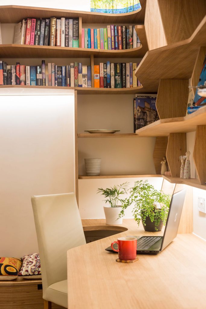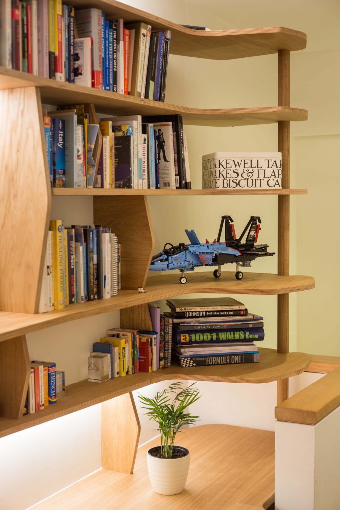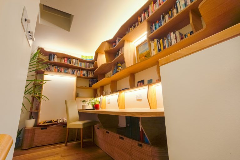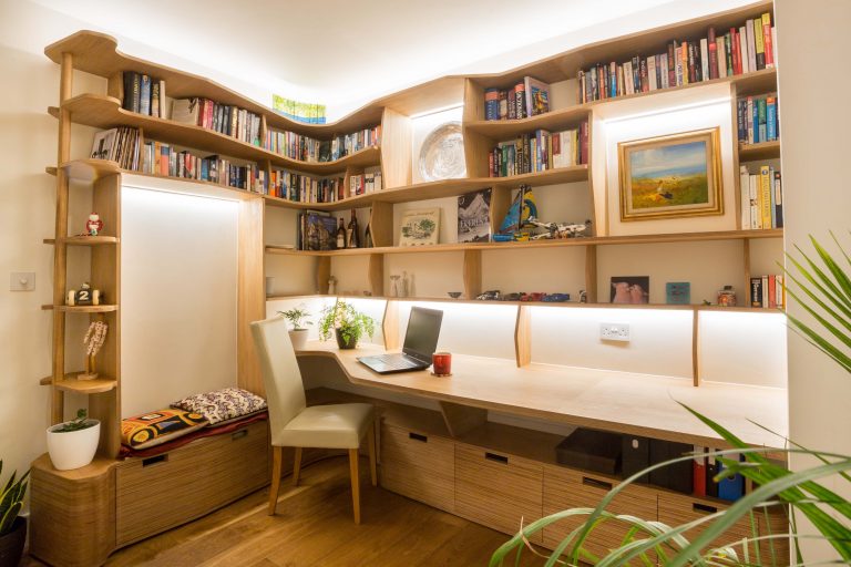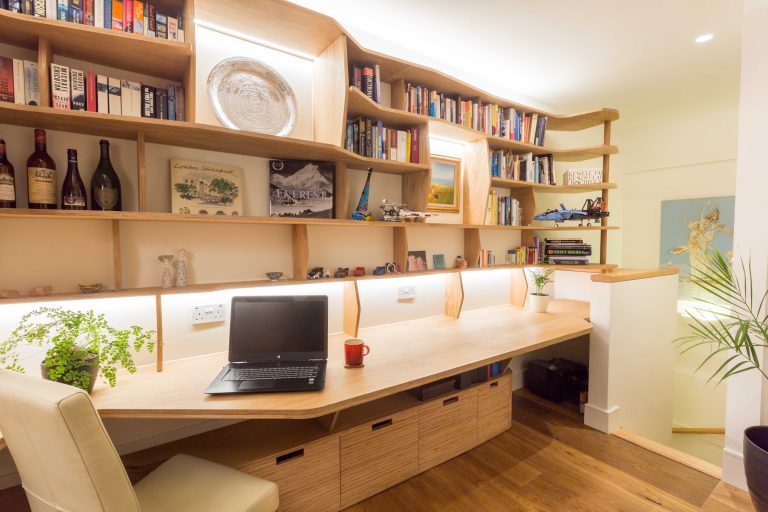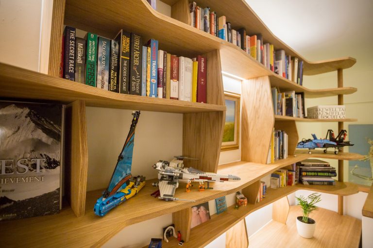 Working closely with the client to achieve all of their needs in limited space, we ended up creating an L-shaped curved drawer area, that doubled up as the bench top for the reading booth. Above that, a curved desk that allows two users at once was created. Following on to the abstract floating shelving units, we lit them with LEDs as per the client’s requirements, and built side shelving held up by a solid oak pole, turned here at the workshop.