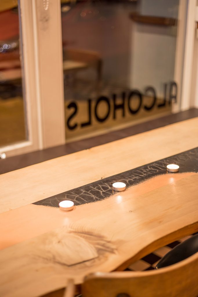 Designing work and full strip out of the building, rebuilding the floor, and removing dry rot from the building. We then went on to install LED drinks cabinets and full length hardwood bar tops, and a live edge table with an epoxy centre running through it.